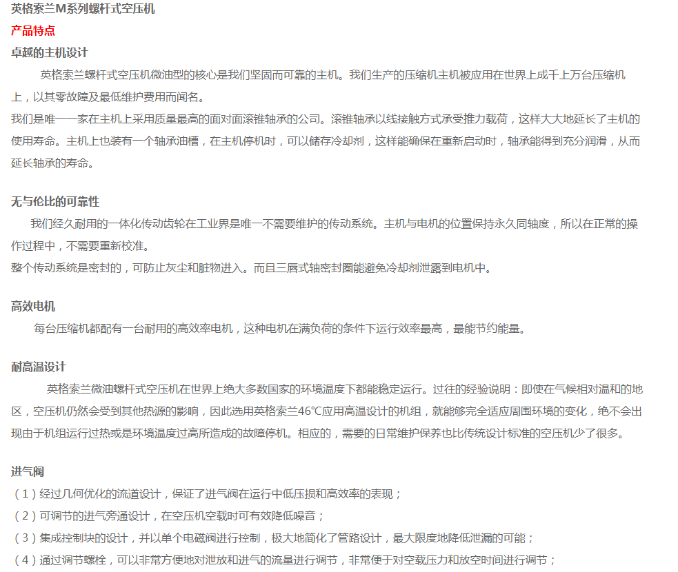 •        濟(jì)南銳博特機(jī)械設(shè)備有限公司是英格索蘭空氣壓縮機(jī)的授權(quán)代理商,代理銷售美國英格索蘭全系列的空壓機(jī)及后續(xù)處理設(shè)備。公司自成立以來,經(jīng)過公司全體同仁不斷努力,開拓創(chuàng)新,以優(yōu)良的技術(shù)、完善的售后服務(wù),使得公司贏得了一個(gè)又一個(gè)的誠心客戶。我公司擁有多名專業(yè)的銷售及售后服務(wù)人員,為客戶提供空壓系統(tǒng)的售前、售中及售后的全方位優(yōu)質(zhì)服務(wù)。另公司有多名具有英格索蘭壓縮機(jī)授權(quán)服務(wù)證書的服務(wù)工程師,能維修和保養(yǎng)國內(nèi)外各種品牌空壓機(jī),公司各種國內(nèi)外品牌空壓機(jī)配件庫存齊全。